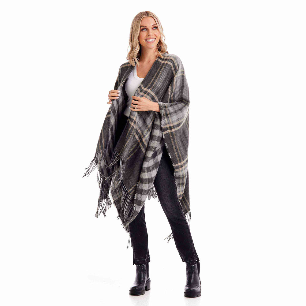 Experience unparalleled comfort all day with our Dark Grey Poncho. Expertly crafted from premium acrylic, this meticulously woven poncho envelops you in pure coziness. Its ingenious reversible design effortlessly transforms your outfit, ensuring endless style possibilities. Adorned with a trendy fringe tassel trim, this poncho seamlessly combines fashion and functionality. It is thoughtfully designed to provide a perfect fit for most body types, measuring approximately 34" from shoulder to hem. Meticulously blended with 51% Acrylic and 49% Polyester, this poncho guarantees exceptional durability and unmatched softness. For optimal care, we recommend delicately hand washing the poncho separately in cold water and gently line drying it.