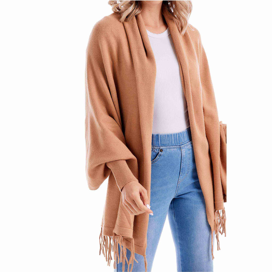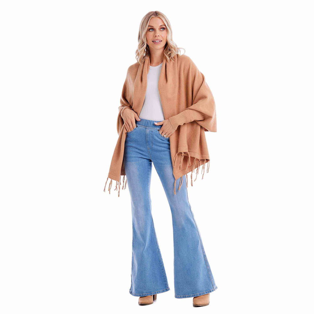 Our stunning Tan Cardigan Wrap is the perfect fashion staple for the stylish Fall season. Crafted from a premium poly blend knit, this glamorous cardigan wrap exudes elegance and comfort. With its convenient sleeve openings, you can easily slip into this piece and embrace the warmth it provides. The cardigan boasts a trendy tassel hem, adding a touch of sophistication to your ensemble. Designed to accommodate most body types, this versatile cardigan is available in one size. It measures approximately 32" from shoulder to hem, ensuring a flattering fit for a range of individuals. Made from a high-quality blend of 48% Rayon, 30% Polyester, and 22% Nylon, this cardigan offers both durability and softness. For easy care, simply machine wash it on cold with like colors and lay it flat to dry.