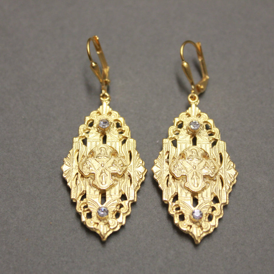 Candace Coin Cross Drop Hoop Earrings in Worn Gold