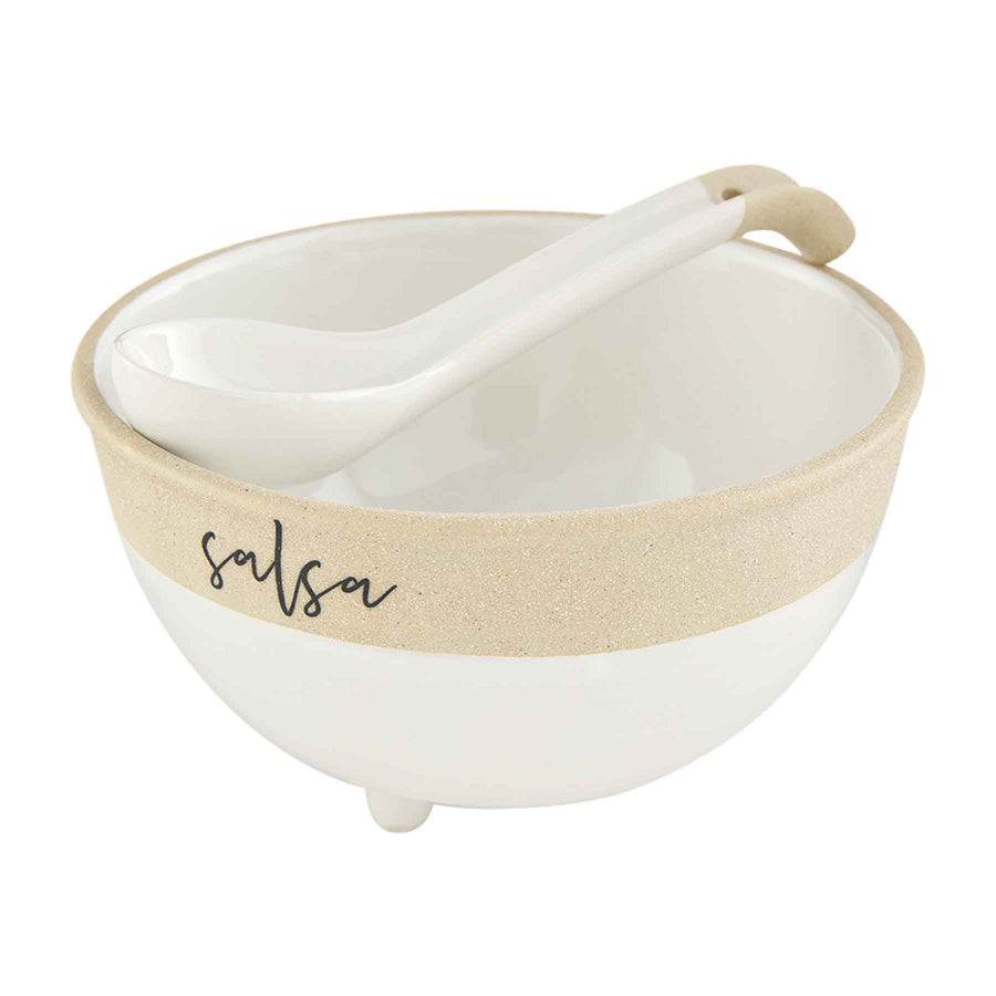 Create your best Salsa recipe and share it in our Farmstead Salsa Dip Set. The two piece set comes with a footed stoneware salsa bowl. The bowl comes with a coordinating spoon that is perfect for scooping your favorite salsa! The front of the bowl features the words "salsa".