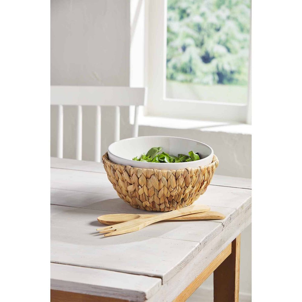 This Hyacinth Serving Bowl Set is a woven classic. The three piece set comes with a stoneware bowl. The bowl comes with a water hyacinth basket. The bowl also comes with wood serving utensils. The set comes with a fork and spoon utensils. Perfect for salads and pastas!