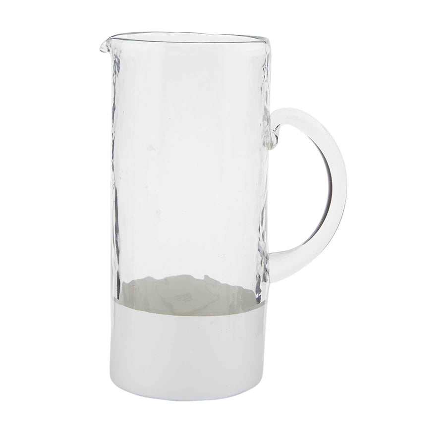 Toss back your favorite drink with our White Two-Tone Glass Pitcher. The hand-painted glass pitcher features textured details on the side. The bottom of the pitcher features a white color-blocked section. This pitcher is perfect for summer gatherings! Fill with your favorite lemonade recipe.