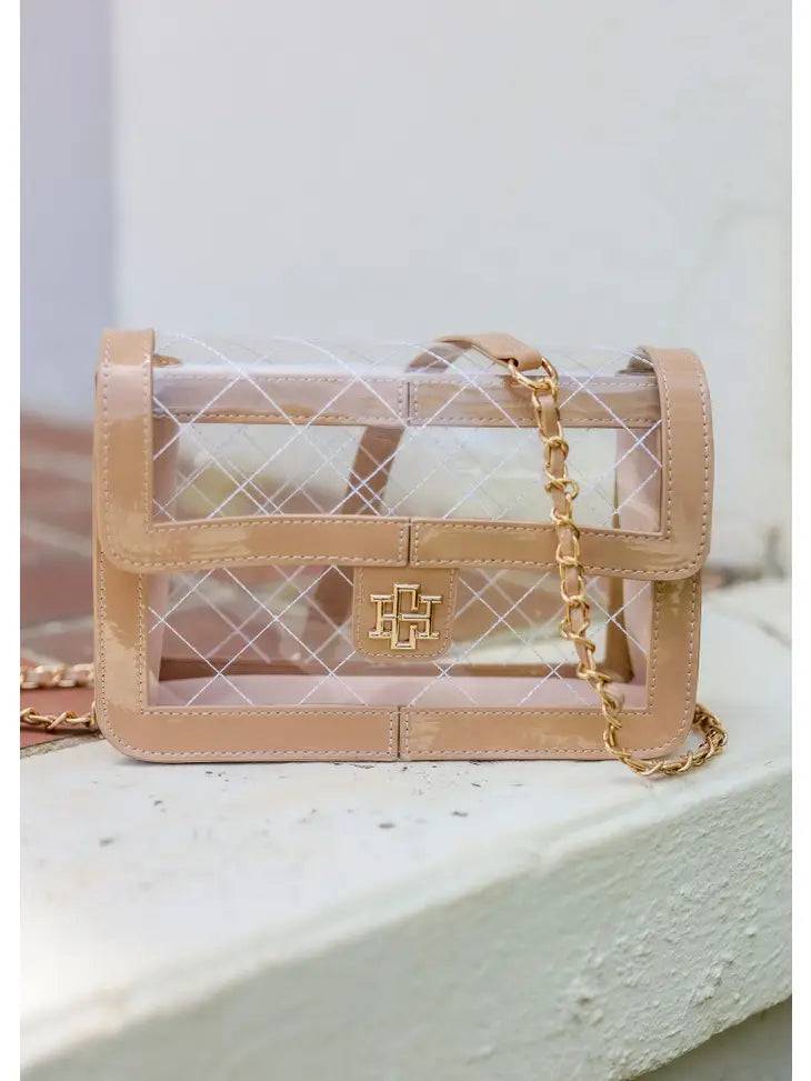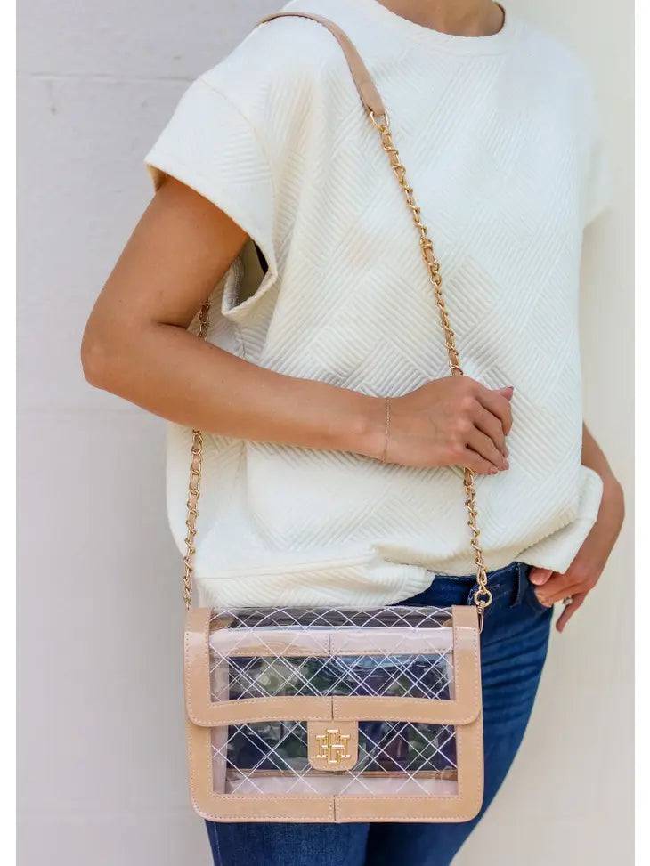 This clear handbag has such an elevated look! Our favorite quality on this bag is the threaded, quilted pattern featured on the front, top, and back of the bag. It has a patent trim with the Caroline Hill logo on the front magnetic flap. The interior base and sides of the bag are lined with a soft, suede-like material. The braided crossbody strap is removable and features a matching patent strip of material to fit comfortably on the shoulder. Dimensions: 7" tall by 10" wide 3" base